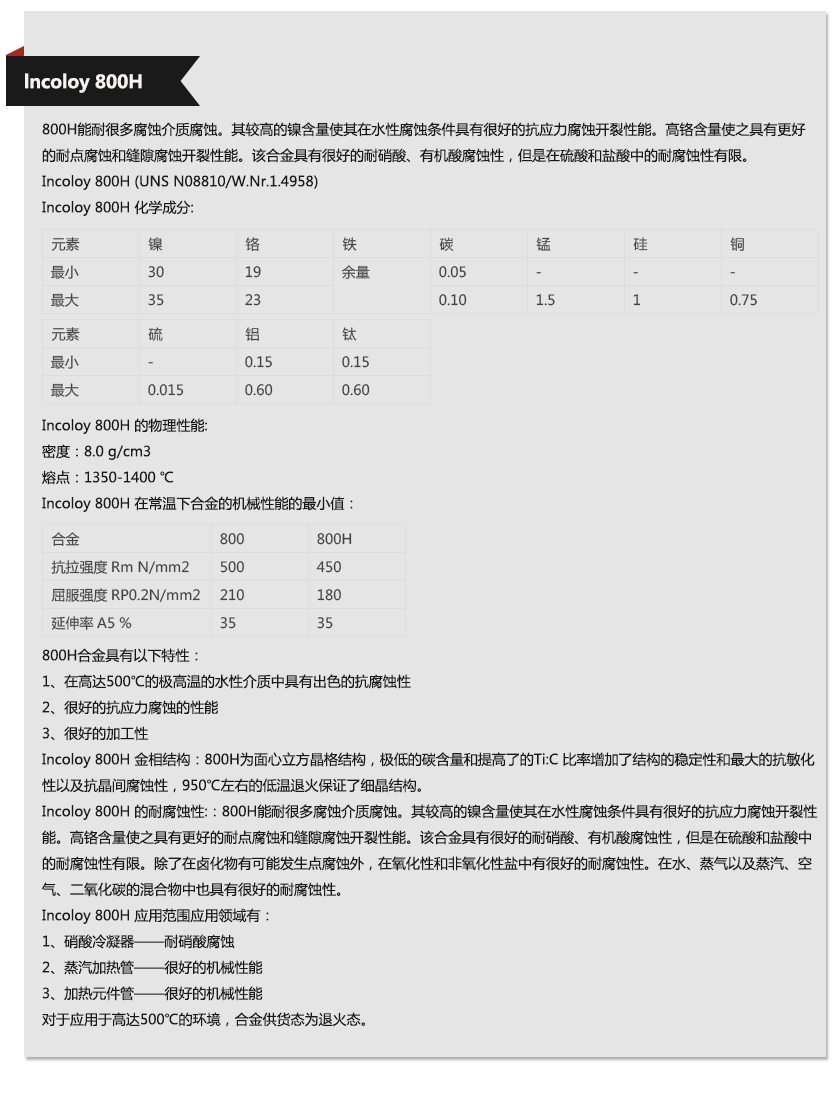 lncoloy 800H管材可分別稱為lncoloy 800H不銹鋼管、lncoloy 800H鋼管、lncoloy 800H不銹鋼無縫管、lncoloy 800H無縫管、lncoloy 800H不銹鋼焊管、lncoloy 800H焊管、lncoloy 800H不銹鋼精密管、lncoloy 800H精密管、lncoloy 800H毛細管等。