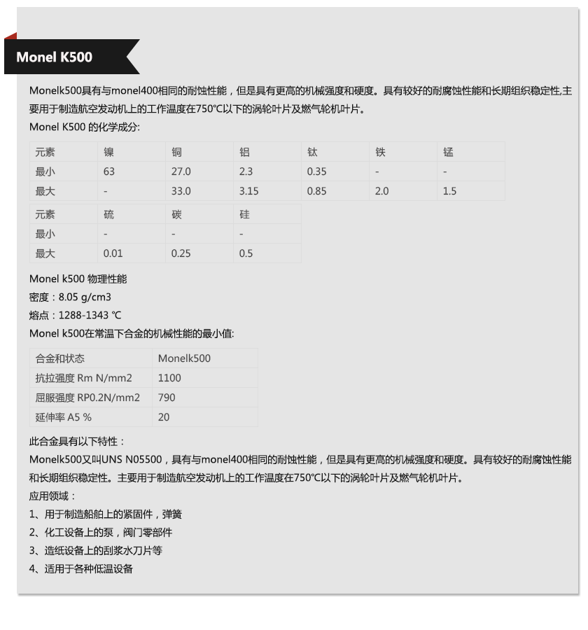 日本Monel K500,美國Monel K500美標,德國Monel K500,瑞典Monel K500,進口Monel K500國標
